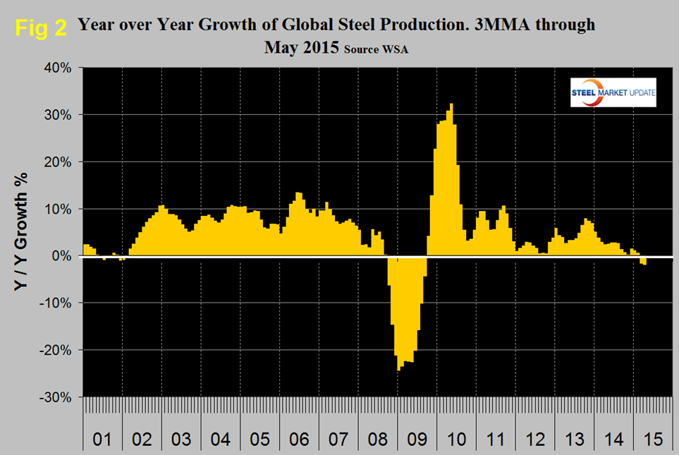 Figure 2 shows the 3MMA of the monthly year over year growth of global steel production which was negative in March for the first time since September 2009. April and May were both down by 2.1 percent year over year. On a three month moving average basis, global growth contracted for five straight months from positive 1.4 percent in December to negative 2.1 percent in April then was unchanged in May. The growth rate in twelve months through May 2015 was 0.3 percent compared to twelve months through May last year.