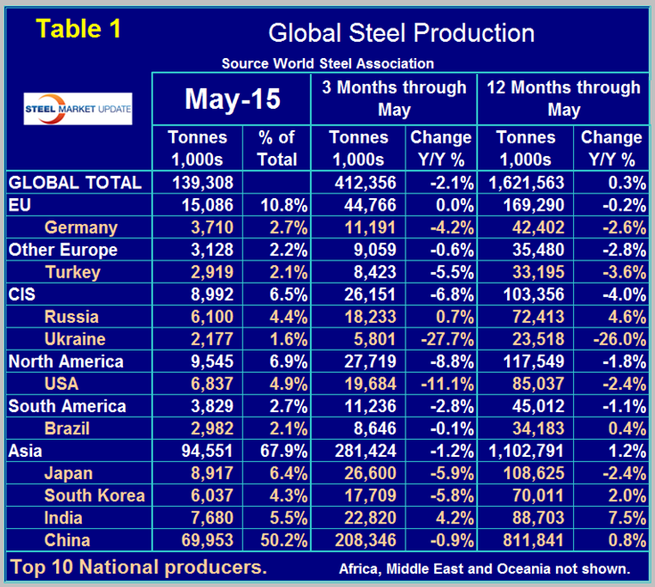 We are again publishing the latest World Steel Association Short Range Outlook forecast for apparent steel consumption in 2015 and 2016. As we stated last month the forecast for 2015 looks optimistic and that is increasingly the case, (Table 2). (Note this forecast is steel consumption, not crude steel production which is the main thrust of what you are reading now.) WSA are forecasting a 0.5 percent growth in demand this year followed by 1.4 percent in 2016.
