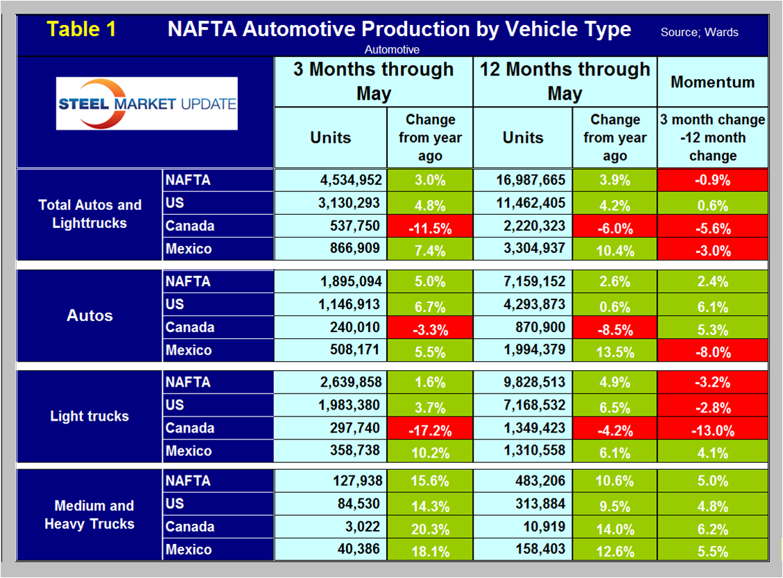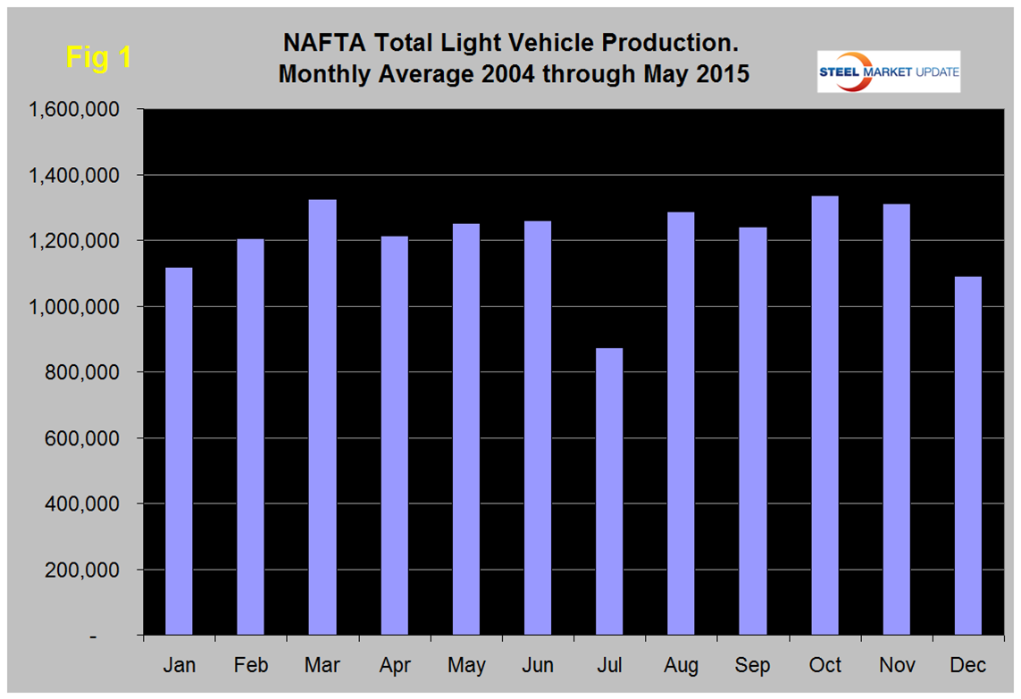 Total light vehicle (LV) production in NAFTA in May was at an annual rate of 17.655 million units, down from 17.905 in April. On average since 2004, May’s production has been 3.2 higher than April, this year May was down by 1.0 percent, (Figure 1). Note: these production numbers are not seasonally adjusted, the sales data reported above are seasonally adjusted. History predicts that production will increase by 0.8 percent in June.