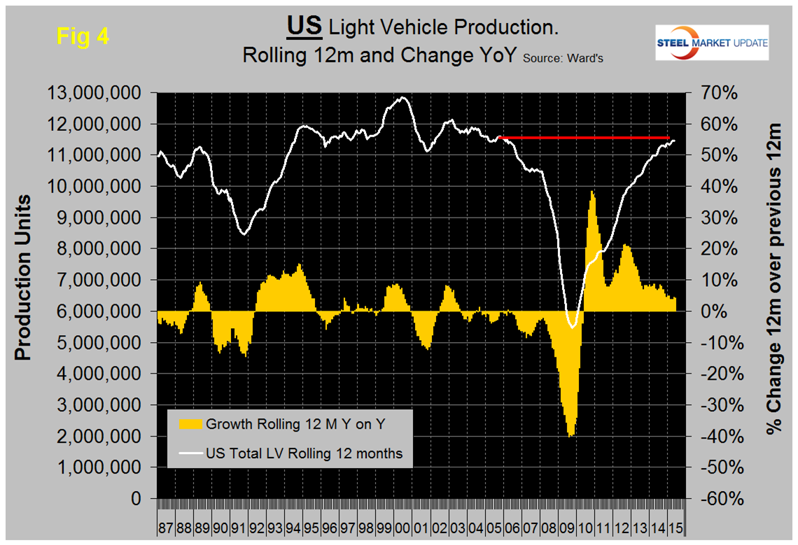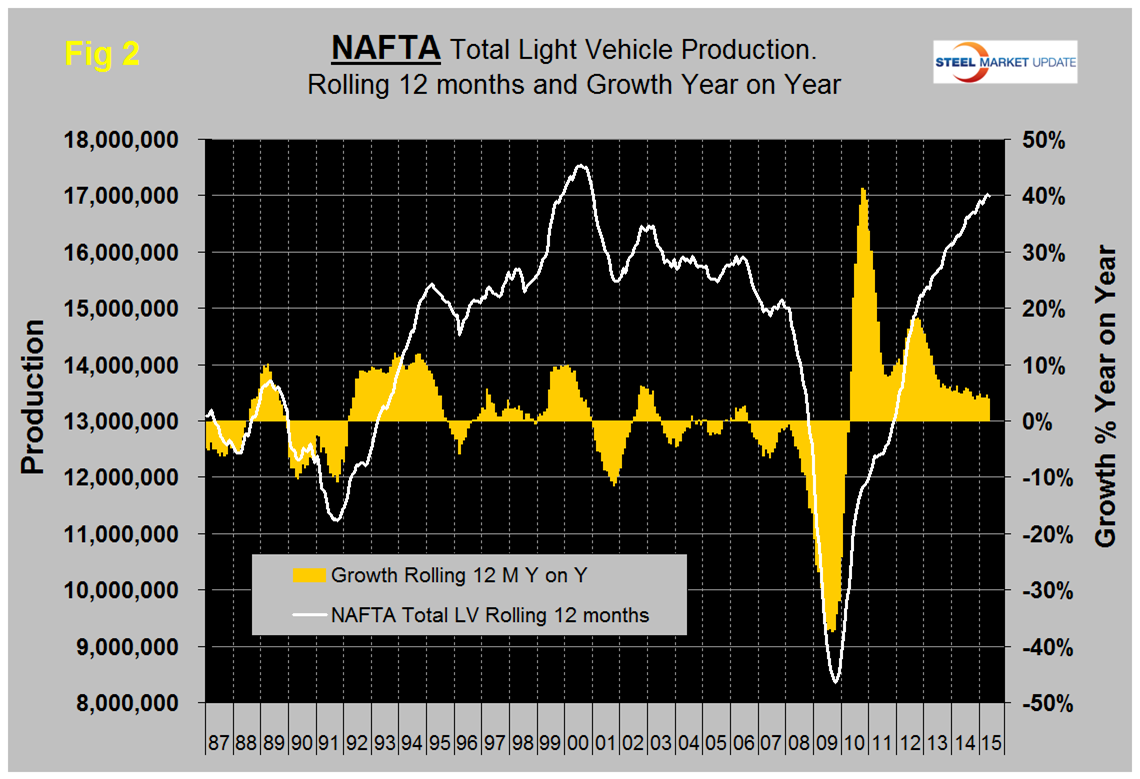 On a rolling 12 months basis y/y LV production in NAFTA increased by 3.9 percent through May. LV production in NAFTA is now well above the pre-recession peak of Q2 2006 and is heading for the all-time high of mid-2000, (Figure 2).