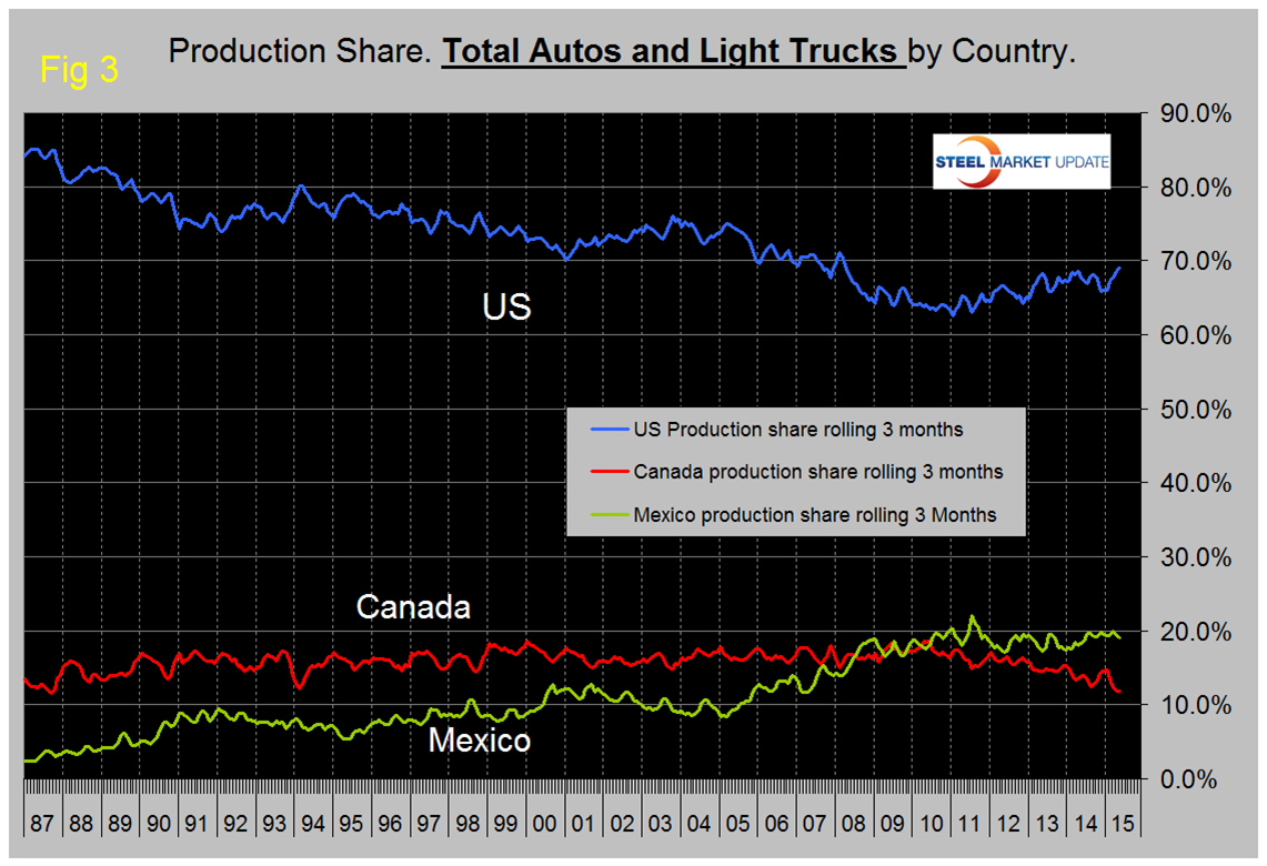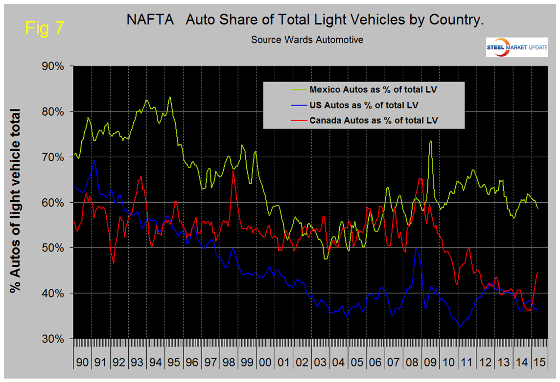 The mix of light vehicles is very different by country, (Figure 7). The percentage of autos in the Mexican mix in the last three months was 58.6 percent but only 36.6 in the US and 44.6 percent in Canada.