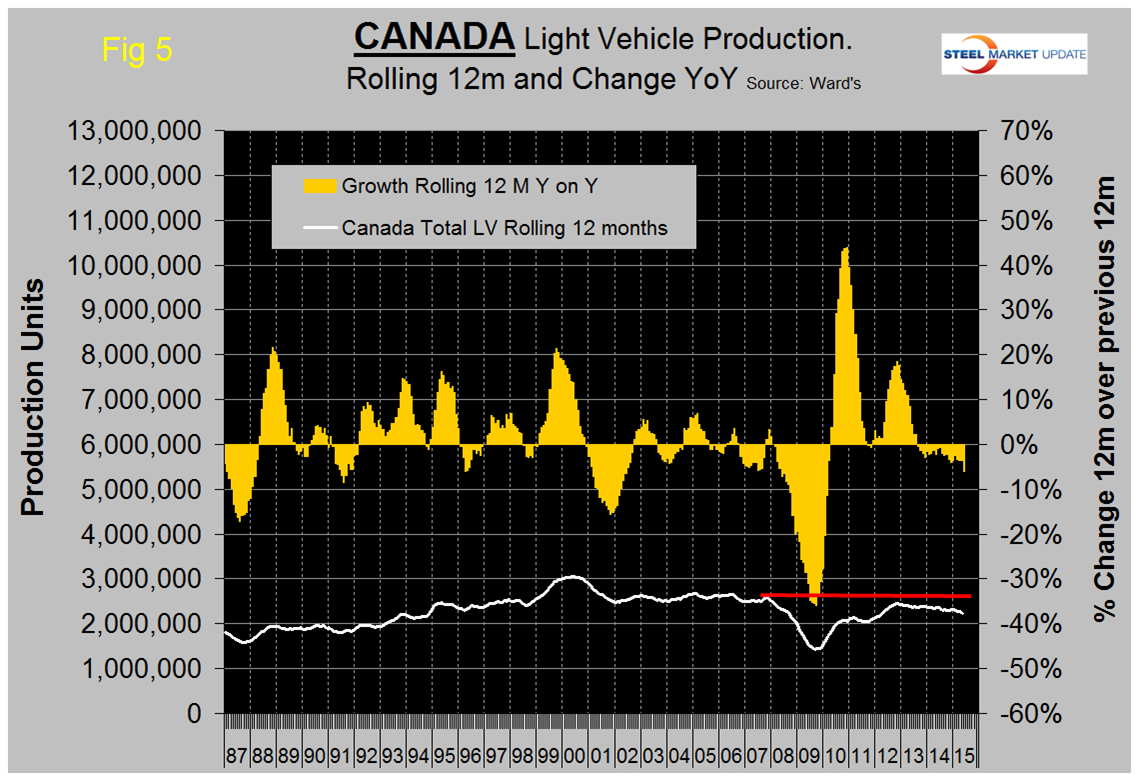 On a rolling 12 months basis y/y the US is up by 4.2 percent, Canada is down by 6.0 percent and Mexico is up by 10.4 percent, (Table 1).