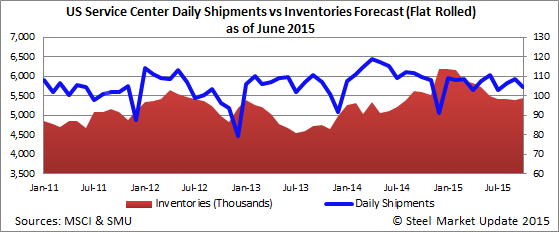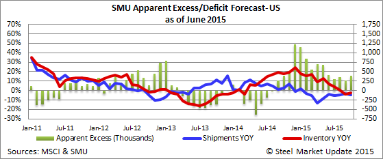 Based on the latest MSCI data and our analysis based on our Apparent Excess/Deficit model, the flat rolled steel service centers have an Apparent Excess of +673,000 tons of inventory as of the end of May.