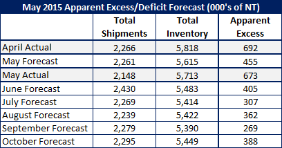 However, if we are incorrect and the distributors bring in material at the three year moving average or greater, then the Apparent Excess numbers will be approximately 200,000 tons per month higher than our forecast shown below.