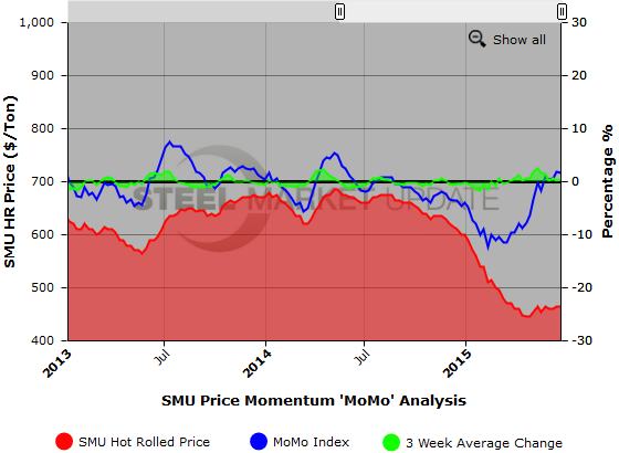 The graph below demonstrates the relationship between the SMU hot rolled coil price, the SMU Price MoMo Index, and the three week moving average change in the MoMo Index. Published in our Tuesday evening issue, the SMU HRC price range for this week is $450-$480 per ton with an average price of $465, unchanged from last week.