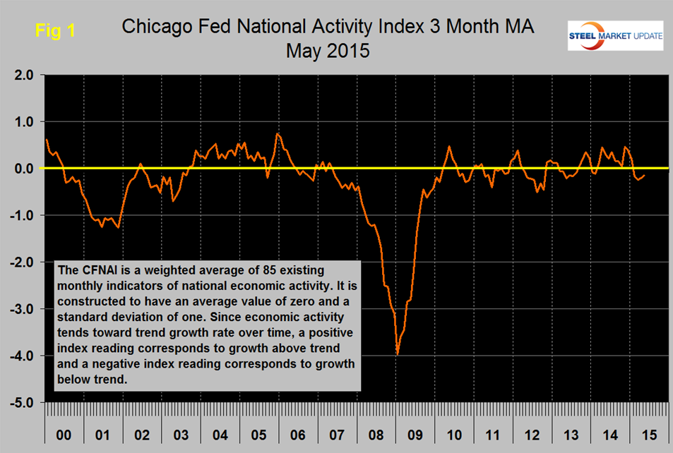 The following is the Chicago Federal Reserve statement followed by our own graphical analysis. The CFNAI is an excellent reality check for much of the economic analysis that we routinely provide in The Steel Market Update and is also a reasonably good predictor of steel demand with a six to nine month lead. For example by the time the steel market went off the cliff in September 2008, the CFNAI had been signaling an increasingly severe problem for eight months. An explanation of the Index is provided at the end of this piece.