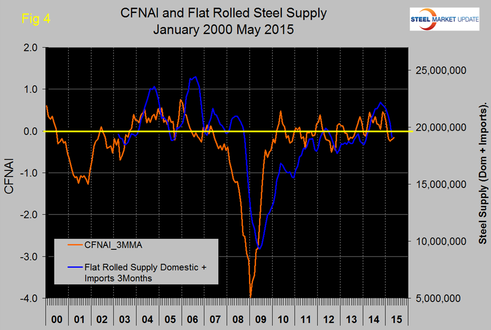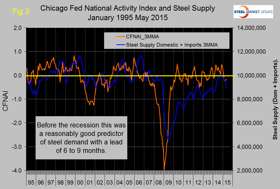 Figure 3 shows that the CFNAI has historically been a reasonably accurate leading indicator of steel demand, (apparent supply) with a lead time of six to nine months.
