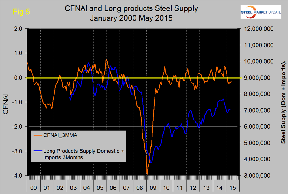 The gap closure has been entirely driven by flat rolled with long products still trailing badly. Based on the historical lead of the CFNAI it looks as though total steel demand will decline for the next few months.