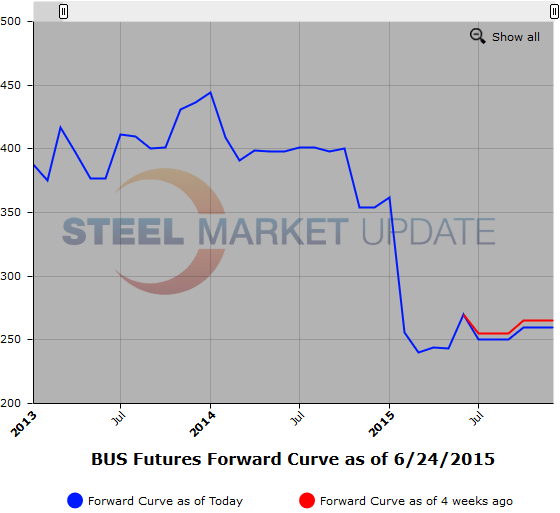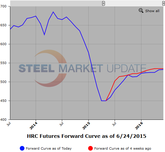 Below is a graphic of the HRC Futures Forward Curve. The interactive capabilities of the graph can only be used in Steel Market Update website here. If you have any issues logging in or navigating the website please contact us at info@steelmarketupdate.com or (800) 432 3475.