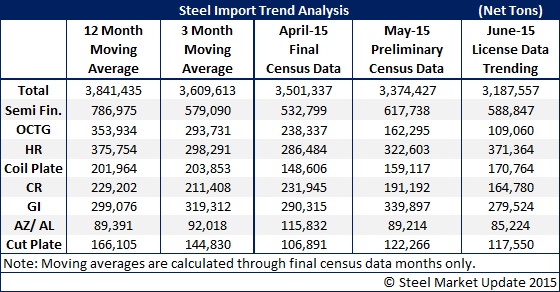 SMU Note: We talk about license requests and Census data all the time. We thought you might appreciate what the license data said regarding the month of May imports. There were 3,522,000 net tons of license requests for the month of May. The 3.374 million ton Preliminary Census number is about 150,000 tons lower than what we saw as the month progressed. We normally take a conservative approach and forecast the projected license number minus approximately 200,000 tons.