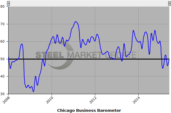 SMU Note: Below is a graphic showing the Chicago Business Barometer history. To use the graphs interactive capabilities, you must view it on our website here. If you need help navigating the website or need to know your login information, contact us at info@SteelMarketUpdate.com or by calling 800-432-3475.