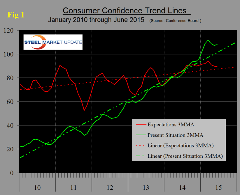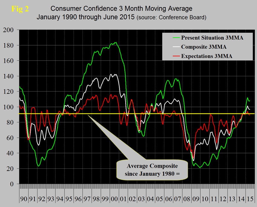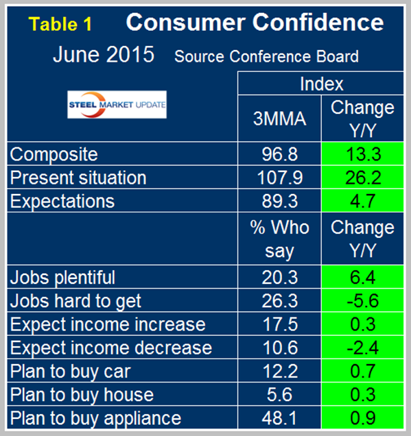The good news is that this is the first time for Table 1 to be all green for as long as we can remember, certainly since before the recession. The four employment sub-indexes which describe job availability and wage expectations have all strengthened in the last year as indicated by the color code green. The year over year trends for auto, home and appliance purchase were all negative in March. Intentions to buy an appliance became positive in April, intentions to buy a car became positive in May and in June all three were positive year over year. Overall in the first six months of 2015, the Conference Board index has had the best performance since Q3 2007.