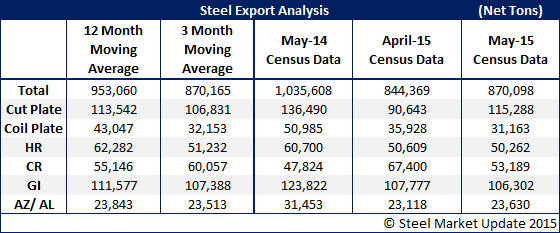 The table below is provided by Steel Market Update and compares May 2015 exports to the three and twelve month moving averages through May, exports one year prior, and the previous month. An interactive graphic can be seen on our website here.
