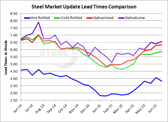 Cold rolled lead times averaged 5.88 weeks, exactly one week less than one year ago and just about the same as the 5.78 reported during the middle of June.