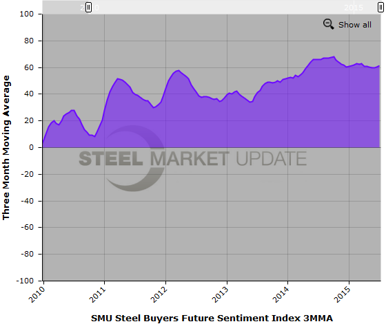 Our Future 3MMA is now +61.50 which is higher than one month ago and the most optimistic reading we have seen going back to the middle of March 2015. From mid-March until early June was saw slippage in the degree of optimism that existed within the flat rolled steel community. Since early June we have seen optimism on a bit of a rebound which to us means, barring any major economic calamity, that the industry expects business conditions to improve as we move through the summer and into Fall 2015.