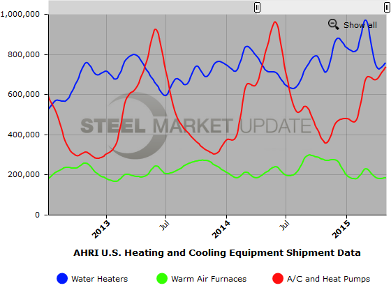 Below is a graph showing the history of water heater, warm air furnace, and air conditioner shipments. You will need to view the graph on our website to use it’s interactive features, you can do so by clicking here. If you need assistance with either logging in or navigating the website, please contact our office at 800-432-3475 or info@SteelMarketUpdate.com.