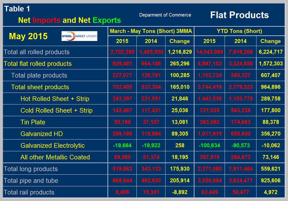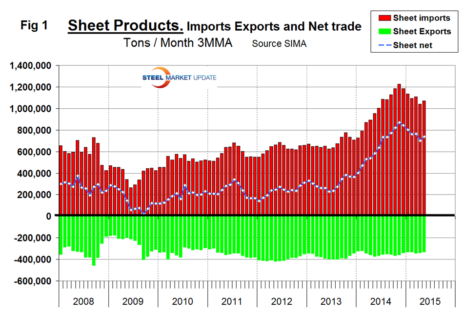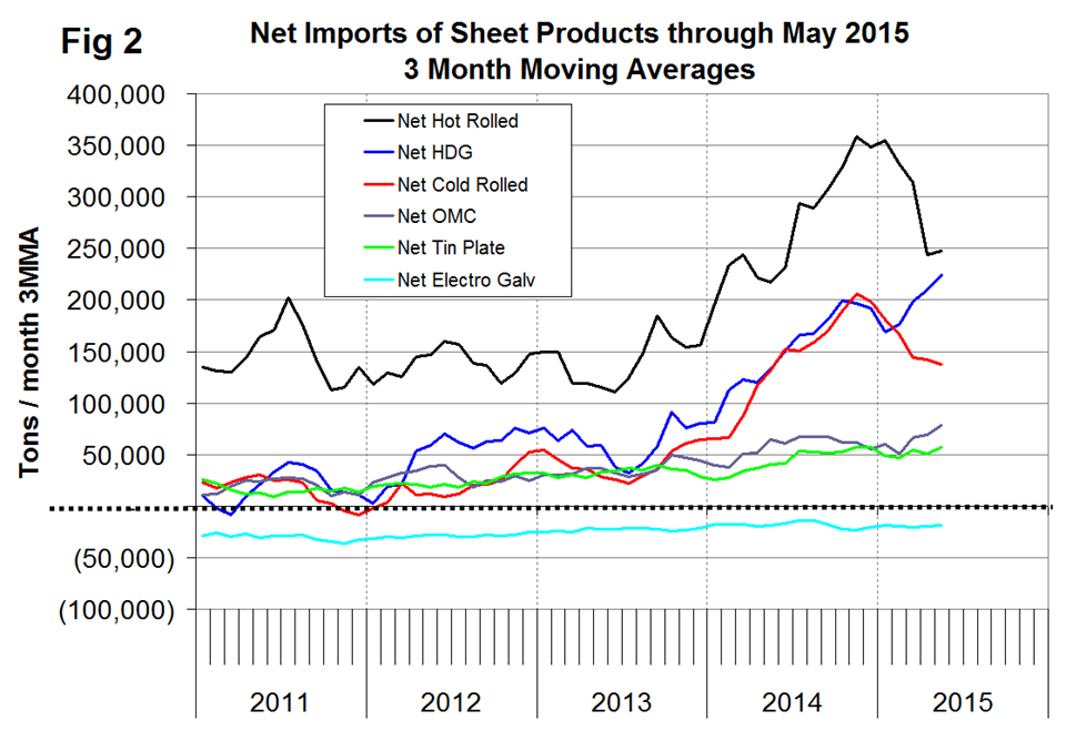 Net imports equals imports minus exports. We regard this as an important look at the overall trade picture and its effect on demand at the mill level. Figure 1 shows that net sheet product imports on a three month moving average (3MMA) basis in May, continue to be more than double that which existed before the recession.