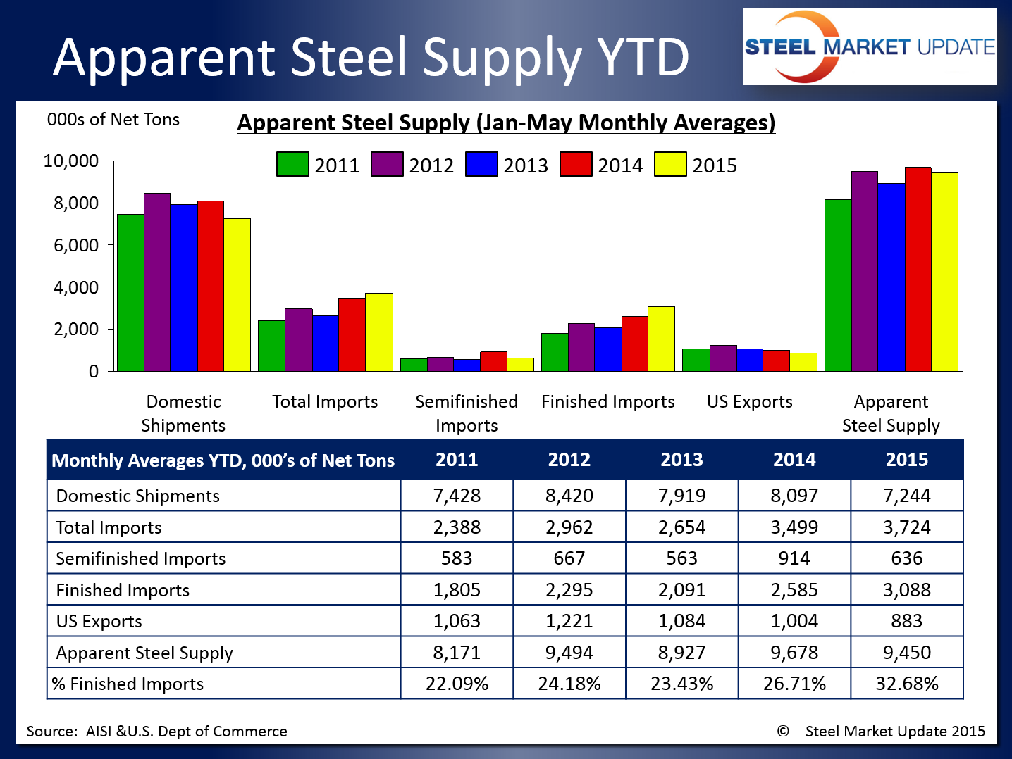 According to the latest data released from the US Department of Commerce and the American Iron and Steel Institute, apparent steel supply for the month of May 2015 was 9,069,541 net tons. Apparent steel supply is calculated by adding domestic steel shipments and finished US steel imports and subtracting total US steel exports.