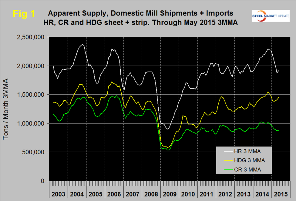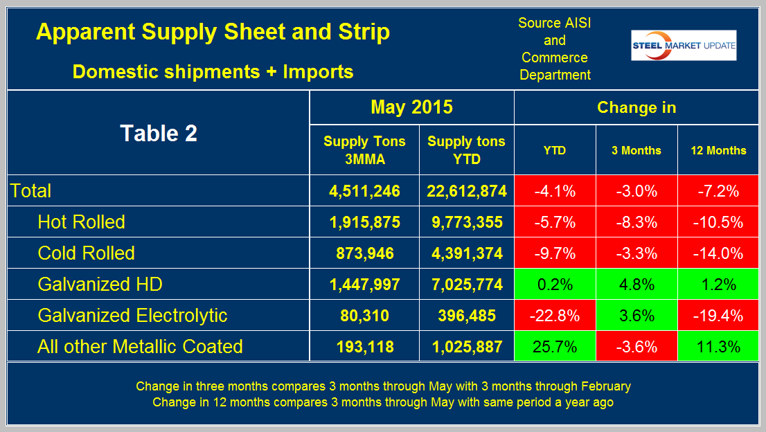 Apparent Supply is a proxy for market demand and is defined as domestic mill shipments to domestic locations plus imports. In the three months through May 2015 average monthly supply of sheet and strip was 4,511,246 tons, down by 3.0 percent from the previous three month period, December through February, down by 7.2 percent from the same period last year and down by 4.1 percent YTD compared to the first five months of 2014. Table 2 shows the change in supply by product on the same basis through May.