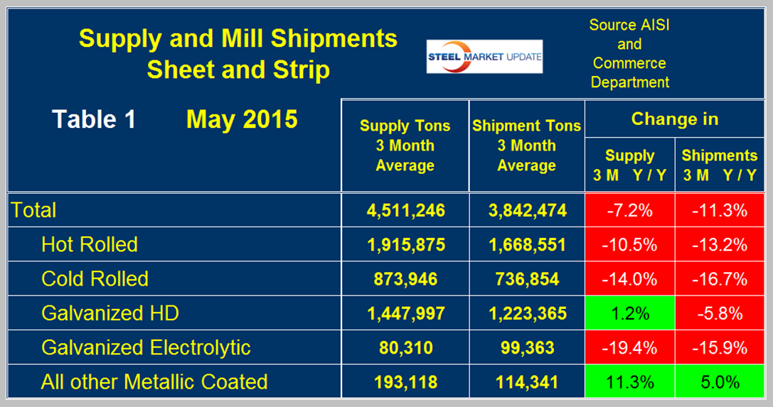 This report compares domestic mill shipments and total supply to the market. It quantifies market direction by product and enables a side by side comparison showing the degree to which imports have absorbed demand. Sources are the American Iron and Steel Institute and the Department of Commerce with analysis by SMU. Table 1 shows both supply and mill shipments of sheet products (shipments includes exports) side by side as a three month average for the periods March through May for both 2014 and 2015.