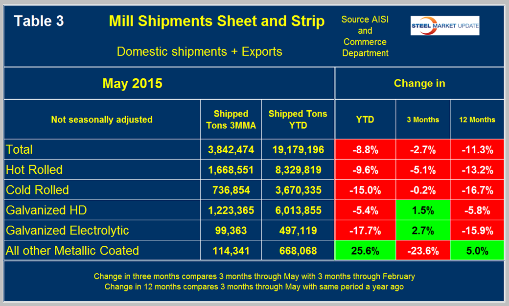 Mill Shipments: Table 3 shows that total shipments of sheet and strip products including hot rolled, cold rolled and all coated products were down by 8.8 percent YTD year over year and down by 2.7 percent in 3 months through May compared to 3 months through February.
