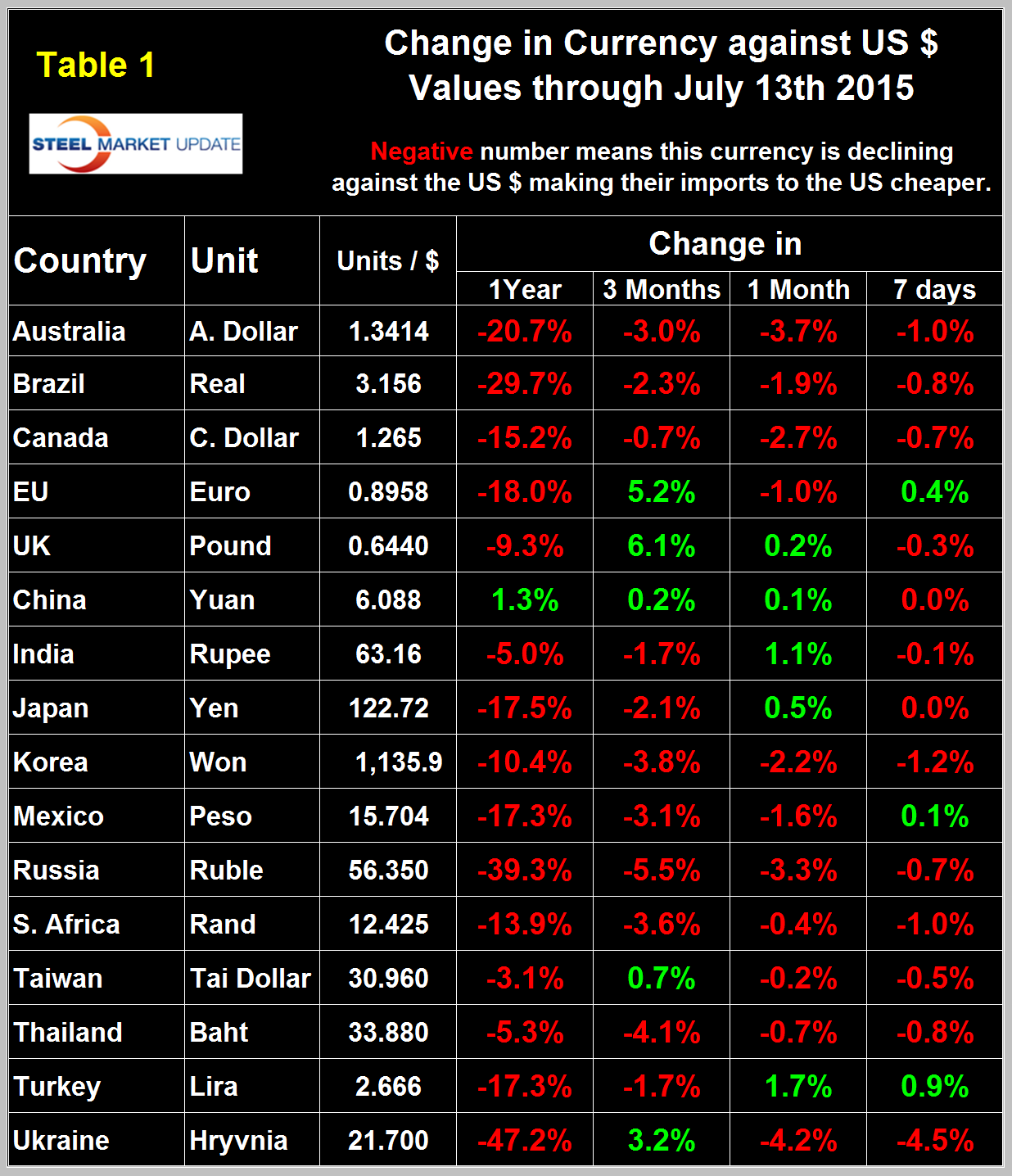 Table 1 shows the number of currency units of steel trading nations that it takes to buy one US dollar and the change in one year, three months, one month and seven days.