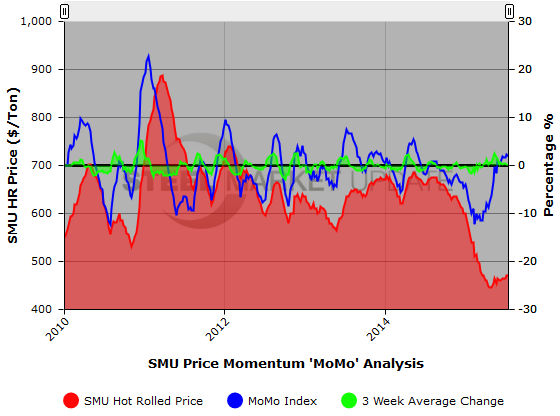 The graph below demonstrates the relationship between the SMU hot rolled coil price, the SMU Price MoMo Index, and the three week moving average change in the MoMo Index. Published in our Tuesday evening issue, the SMU HRC price range for this week is $460-$480 per ton with an average price of $470, unchanged from last week.