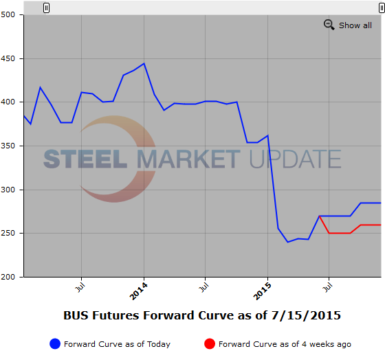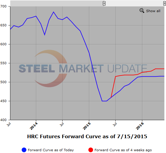 Below is a graphic of the HRC Futures Forward Curve. The interactive capabilities of the graph can only be used in Steel Market Update website here. If you have any issues logging in or navigating the website please contact us at info@steelmarketupdate.com or (800) 432 3475.