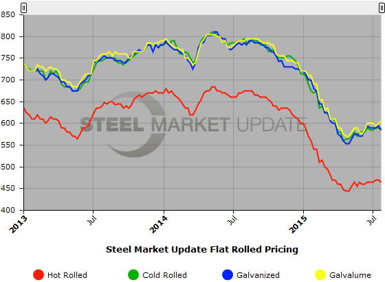 SMU Note: Below is a graphic showing our hot rolled, cold rolled, galvanized, and Galvalume price history. To use the graphs interactive capabilities, you must view it on our website here. If you need help navigating the website or need to know your login information, contact us at info@SteelMarketUpdate.com or by calling 800-432-3475.