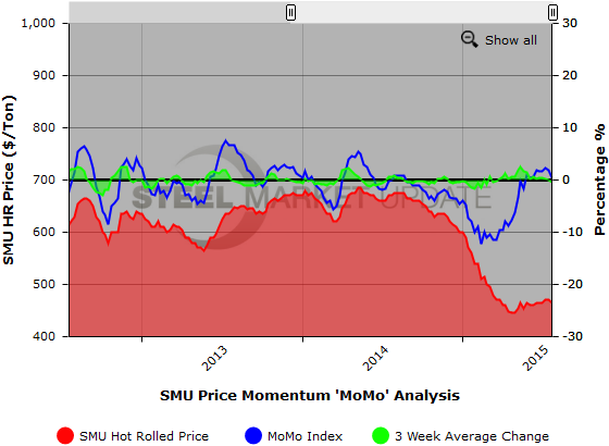 The graph below demonstrates the relationship between the SMU hot rolled coil price, the SMU Price MoMo Index, and the three week moving average change in the MoMo Index. Published in our Tuesday evening issue, the SMU HRC price range for this week is $450-$480 per ton with an average price of $465, down $5 per ton from last week.