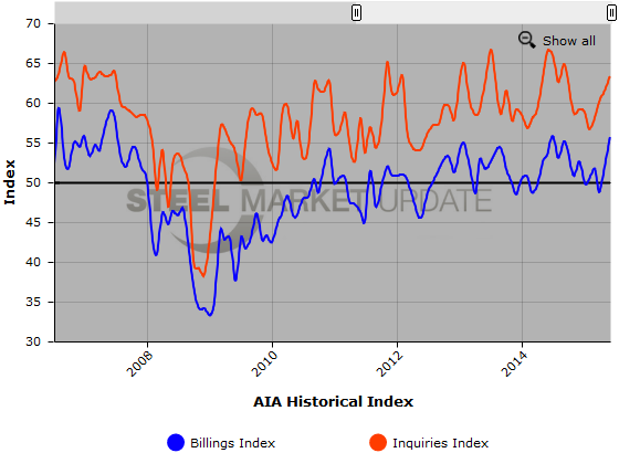 Below is a graph showing the history of the AIA Billings and Inquiries Index. You will need to view the graph on our website to use it’s interactive features, you can do so by clicking here. If you need assistance with either logging in or navigating the website, please contact our office at 800-432-3475 or info@SteelMarketUpdate.com.