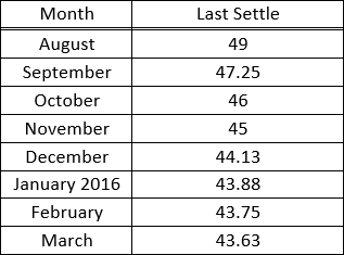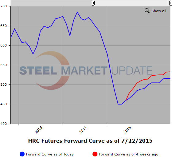 Buyers are likely living with minimal fear of a massive surge in steel prices while raw materials like iron ore and scrap continue to plunge, especially since that is what they are forecasted to continue doing. Despite a modest bounce in today’s session, the backwardation in iron ore markets has not subsided. By the time the calendar flips to 2016, iron ore is projected to be well below $45/tonne. Here is the current forward curve from NYMEX on last settlement ($/metric tonne):