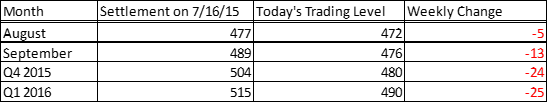 So the current forward curve is projecting some that stability may find us… in 2016…just below $44/tonne. Given that context, perhaps the forward curve for steel is just catching up. We also can’t divorce steel from the broader commodity markets; Copper is down another 2.2% in today’s trading compared to yesterday’s close. That continues a disastrous run for the red metal which has seen the most active contract (September CMX) fall from a peak of nearly $2.95/lb in May to just below $2.38/lb today, nearly a 20% drop.