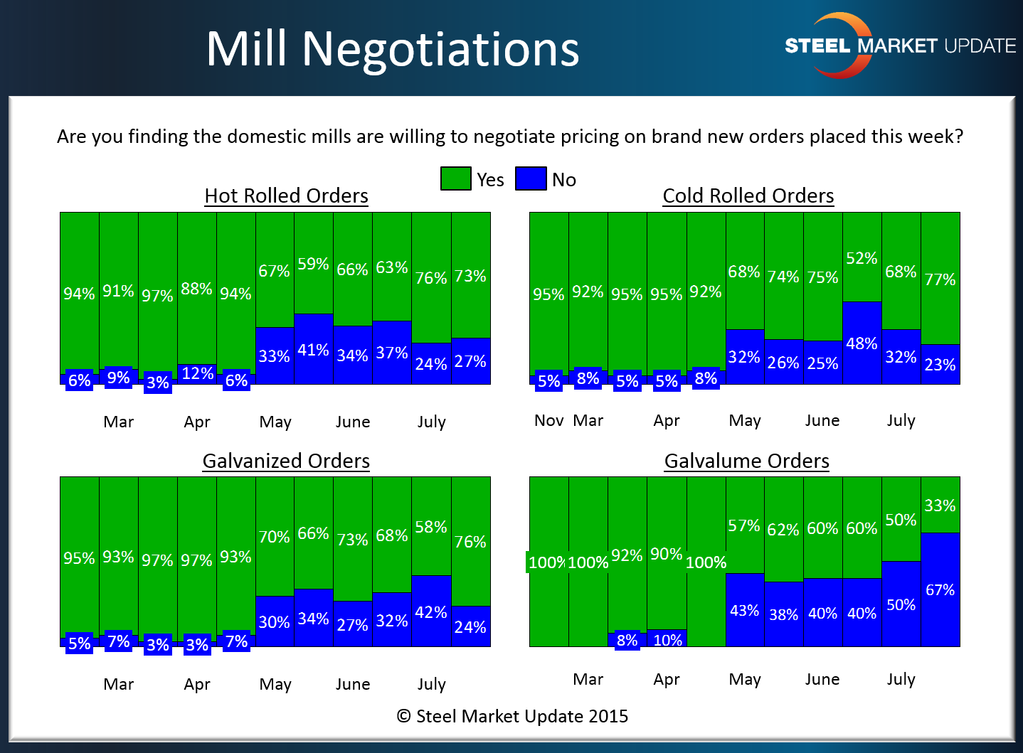 In this week’s flat rolled steel market analysis, those responding to our questionnaire reported all but Galvalume as being highly negotiable (70 percent level or higher). Hot rolled (73 percent, cold rolled (77 percent) and galvanized (76 percent) improved modestly during the month of May and have essentially trended sideways since.