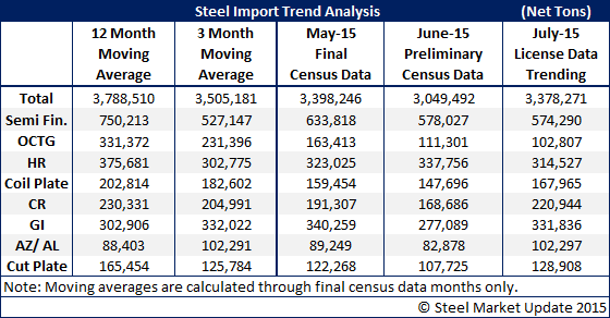 Late last week the US DOC released Preliminary Census Data for the month of June and it is showing the month as being just over 3 million net tons (remember that the government data when released is in metric tons and we convert it to net tons). The number is 348,754 net tons less than what was the final tally for the month of May. At the moment July 2015 licenses are trending toward a bigger month for imports than June. We believe this is due to a large number of tonnage arriving in galvanized and Galvalume due to the trade suit (tonnage needs to arrive before August 27th or face potential duties).