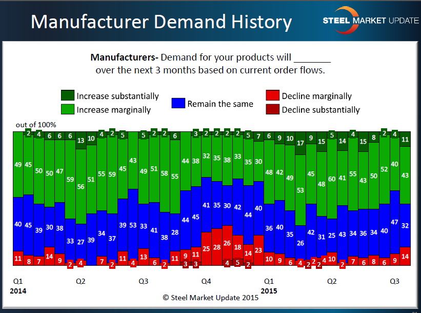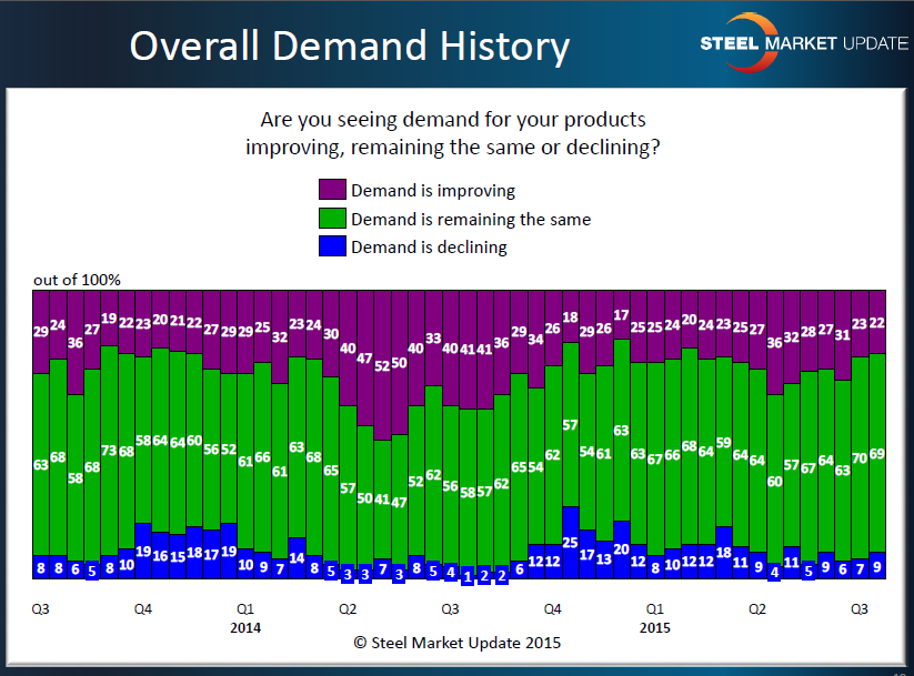 As you can see last year (2014), we saw strong demand growth during the late first and through most of the second quarter before slowing a bit in third quarter and then dropping off at the end of the year. So far this year (2015), we did not see the growth we would expect to see during the second quarter and, with 22 percent reporting demand as improving, we are at the lowest level seen since the first quarter of this year.