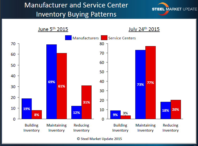 In the graphic below, SMU is concentrating on evaluating whether service centers or manufacturing companies are either building or reducing inventories and if inventories should be considered balanced (as there is always a small percentage of companies having to build or reduce depending on market pressures, seasonal issues, etc.). We found that the vast majority of the service centers and manufacturing companies were reporting inventories as being balanced (77 percent service centers and 73 percent manufacturing companies). The percentage of distributors reporting their company as reducing inventories dropped from 31 percent at the beginning of June to 20 percent this past week. Manufacturing companies remained about the same as what they were reporting at the beginning of June.