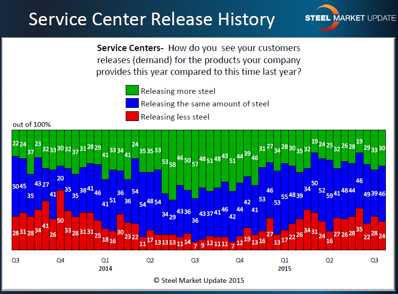 From the service center perspective we saw a balanced trend as we asked them about demand based on releases of steel this year compared to the prior year. Thirty percent reported that their customers were releasing more steel, 24 percent reported their customers as releasing less steel and the balance (46 percent) reported that they were releasing about the same amount of steel as the previous year.