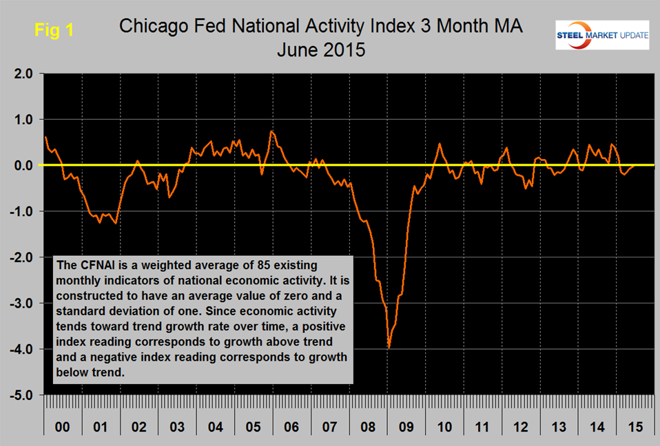 The following is the Chicago Federal Reserve statement followed by our own graphical analysis. The CFNAI is an excellent reality check for much of the economic analysis that we routinely provide in at Steel Market Update and is also a reasonably good predictor of steel demand with a six to nine month lead. For example by the time the steel market went off the cliff in September 2008, the CFNAI had been signaling an increasingly severe problem for eight months. An explanation of the Index is provided at the end of this piece.