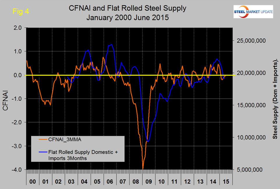 Figure 3 shows that the CFNAI has historically been a reasonably accurate leading indicator of steel demand (apparent supply) with a lead time of six to nine months.