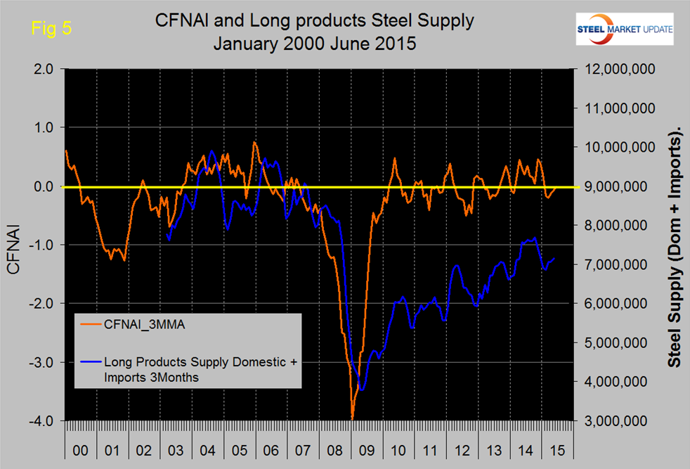 The gap closure has been entirely driven by flat rolled with long products still trailing badly. Based on the historical lead of the CFNAI it looks as though total steel demand will pick up slightly in the third quarter.
