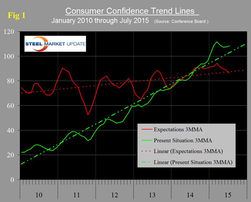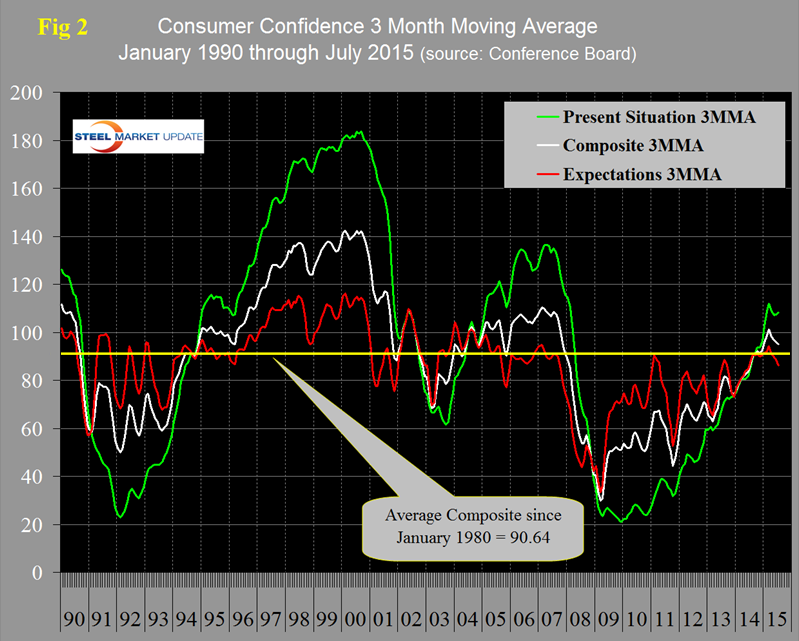 The official news release from the Conference Board included at the end of this piece draws quite negative conclusions on a month over month basis. In our opinion this month’s outcome is another example of why not to get too carried away by one month’s result in either direction. The composite value combines the view of the present situation and expectations and its three month moving average (3MMA) declined by 1.1 points. The 3MMA of the view of the present situation improved by 0.8 points and expectations declined by 2.4 points. The composite value of consumer confidence has been much more erratic this year than it was in 2014. In all of last year the monthly change ranged from + 5.1 to – 4.4, this year the range has been + 10.7 to – 8.9 points. There is no multi month trend in recent data therefore we see no reason to be concerned about the July result which is slightly higher than the 25 year average. The 3MMA of the present situation continues to be above the five year trend line and that of expectations is now slightly below its 5 year trend line (Figure 1).