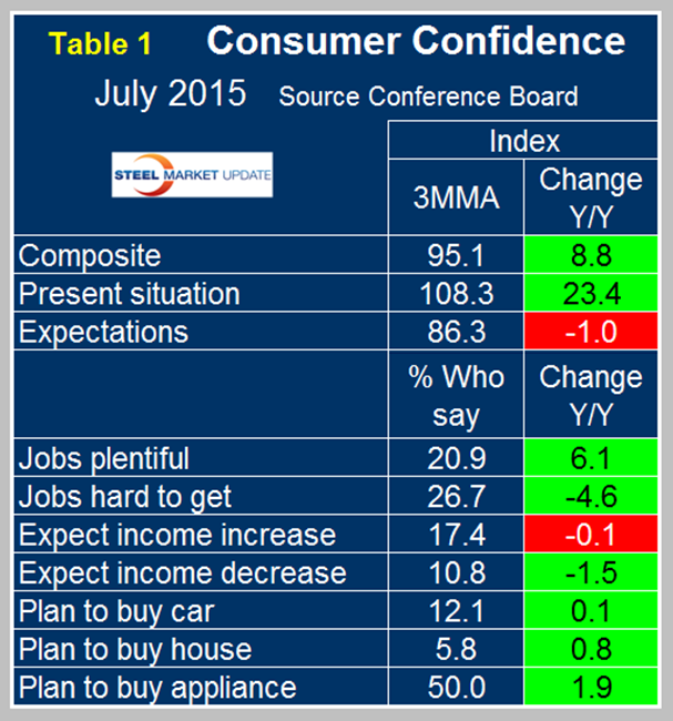 Says Lynn Franco, Director of Economic Indicators at The Conference Board: “Consumer confidence declined sharply in July, following a gain in June. Consumers continue to assess current conditions favorably, but their short-term expectations deteriorated this month. A less optimistic outlook for the labor market, and perhaps the uncertainty and volatility in financial markets prompted by the situation in Greece and China, appears to have shaken consumers’ confidence. Overall, the Index remains at levels associated with an expanding economy and a relatively confident consumer.”