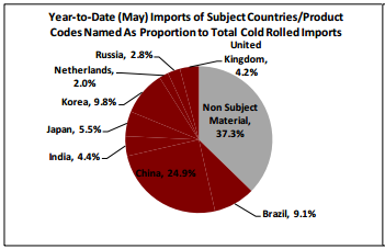 Keybanc metals and mining analysts Philip Gibbs & Tyler Kenyon reported to their clients this morning, “Year-to-date cold-rolled volumes through May from alleged countries (793,360 tons) – up 44% YTD YOY – accounting for roughly 63% of total cold-rolled imports, 17% of total sheet imports, and 5% of total finished steel imports. Of total cold rolled sheet imports (subject and non subject) subject material from Brazil accounted for 9%, China 25%, India 4%, Japan 6%, Korea 10%, Netherlands 2%, Russia 3%, and the U.K. 4%.” The graphic below was part of the Keybanc report/analysis.