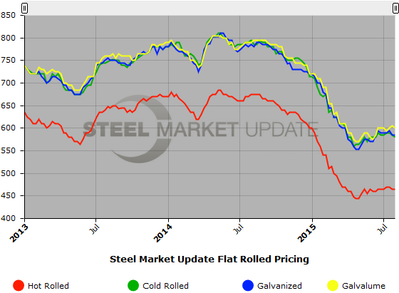 SMU Note: Below is a graphic showing our hot rolled, cold rolled, galvanized, and Galvalume price history. To use the graphs interactive capabilities, you must view it on our website here. If you need help navigating the website or need to know your login information, contact us at info@SteelMarketUpdate.com or by calling 800-432-3475.