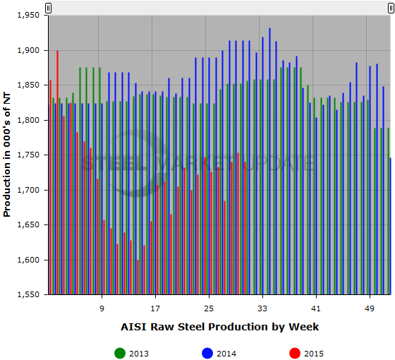 For the week ending July 25, 2015, the American Iron & Steel Institute (AISI) estimated the U.S. steel industry produced 1,740,000 net tons of raw steel, a 0.7 percent decrease over the previous week and a 9.1 percent decrease over the same week one year ago. The estimated capacity utilization rate is 72.8 percent, down from 73.3 percent last week and down from 79.6 percent last year.