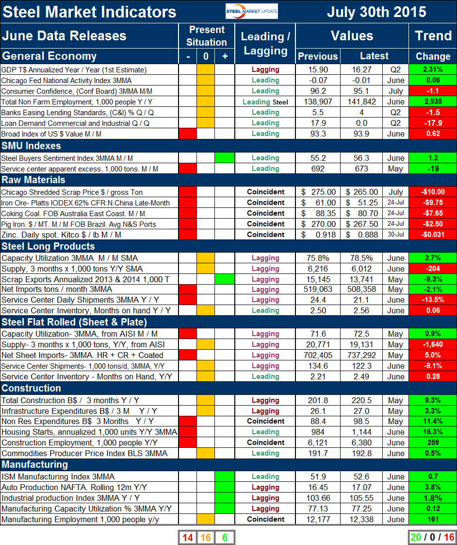 The number of indicators classified as positive peaked at 17 in October last year and now stands at 7 with a steadily declining trend. Changes that occurred in the month of July were as follows; GDP was re-classified from positive to neutral on the basis of this week’s first estimate for growth in Q2 2015. We base our evaluation on a trailing 12 month result which is currently less than our positive threshold of 2.5 percent. The price of zinc at the end of July fell below 90 cents per lb. and we re-classified it from neutral to negative. Capacity utilization of the long product mills was re-classified from negative to neutral with a value of 78.5 percent. The performance of the long product mills is based on SMA data and of the flat rolled mills on AISI data. There were no changes in our perception of the present situation of the indicators describing the flat rolled steel market, or the construction and manufacturing sectors. A quick visual appraisal of the present situation shows that the general economy is basically neutral. Steelmaking raw materials are historically weak through July’s data. The present situation of the flat rolled steel sector is very similar to that for long products. Construction continues to be weak to neutral and manufacturing continues to be neutral to strong. Both nonresidential and residential construction starts are rated historically negative as is the total number of people employed in construction. No indicators are currently rated positive in the construction category. None of the manufacturing indicators on a present situation basis are currently negative. Four are positive and one, manufacturing employment is neutral.