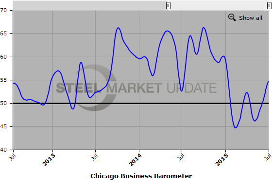 The Chicago Business Barometer pulled out of contraction in July with a gain of 5.3 points to register 54.7, indicating an expansion in manufacturing activity.