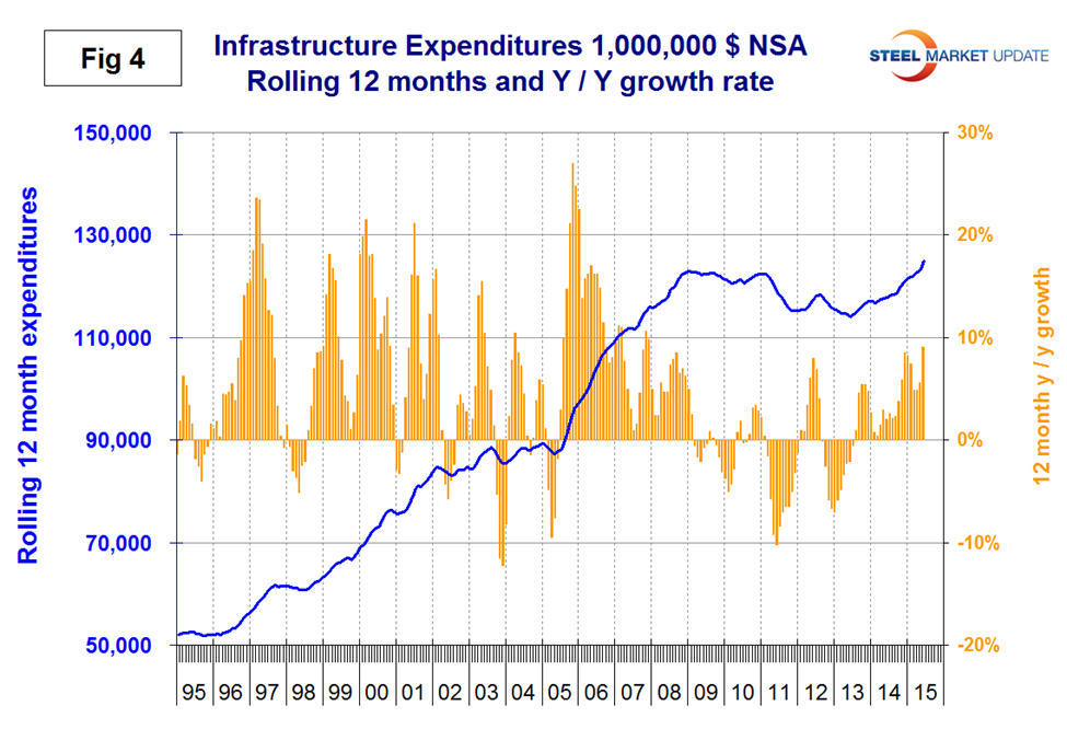 Highway pavement is the main subcomponent of highways and streets and had a 5.3 percent positive growth in three months through June following negative 5.0 percent in March, negative 2.2 percent in April and negative 2.0 in May. Bridge work contracted every month in Q4 2014 but has since expanded every month this year (Not a seasonal effect as we are considering year/year data). Bridge work totaled $3.1 billion in the single month of June with a strong 14.4 percent growth rate. Uncertainty about the future of federal funding is likely to last into at least October this year and this uncertainty results in state governments postponing major projects. That will mean restrained increases in infrastructure starts for both 2015 and 2016. Later this year, hopefully, new legislation will combine with improved state finances and innovative approaches to funding surface transportation projects to lift construction starts more vigorously. Water supply returned to positive growth in June after a slight contraction in May which broke a 10 straight months of expansion. Based on reports of the critical state of water supply out west this sector is likely to have major growth in the next few years. Conservation expenditures have been surging since November 2013 but the outlays are relatively small. On a rolling 12 month basis, infrastructure expenditures are now higher than they were before the recession (Figure 4).