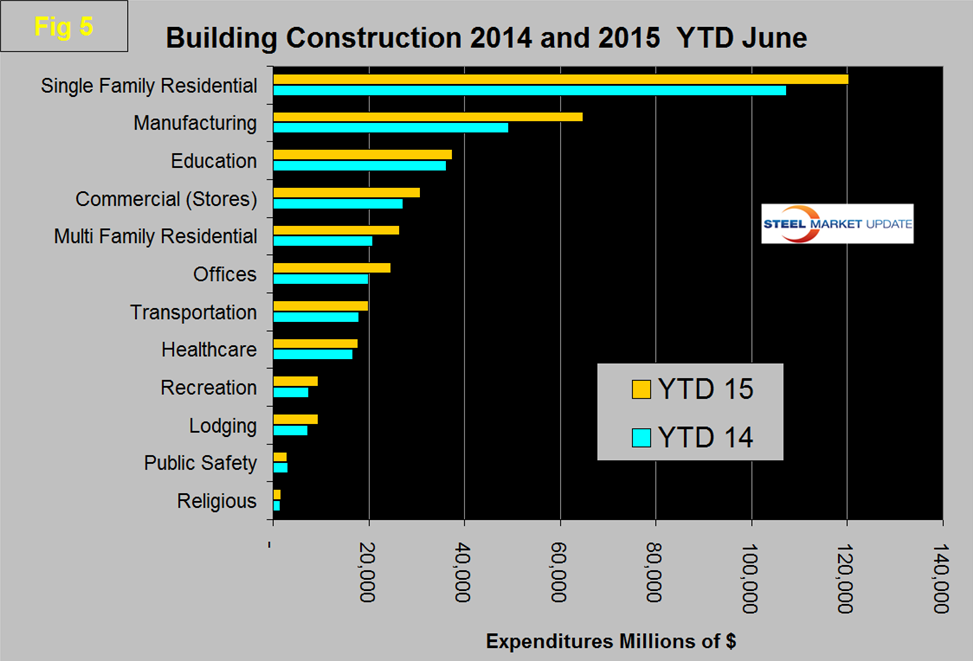 Total Building Construction Including Residential: Figure 5 compares YTD expenditures for building construction for 2014 and 2015.